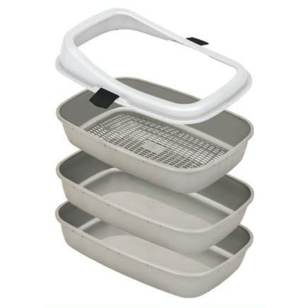Πρωτοποριακή λεκάνη απορριμμάτων για γάτες που αποτελείται από ένα κόσκινο και δύο λεκάνες που καθαρίζουν εύκολα τα απορρίμματα. Διαθέτει ένα έξυπνο σύστημα καθαρισμού χωρίς σέσουλα που επιτρέπει να ρίχνετε τα απόβλητα απευθείας στο δοχείο. με ειδικό σύστημα που διαχωρίζει την άμμο από τα περιττώματα και σας δίνει τη δυνατότητα να κάνετε μεγαλύτερη οικονομία στην άμμο.